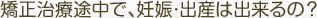 通常の矯正治療は問題なく続けられます。今までも、矯正治療中に妊娠・出産された方もいらっしゃいます。産後、お子さまを連れて通院いただけます。